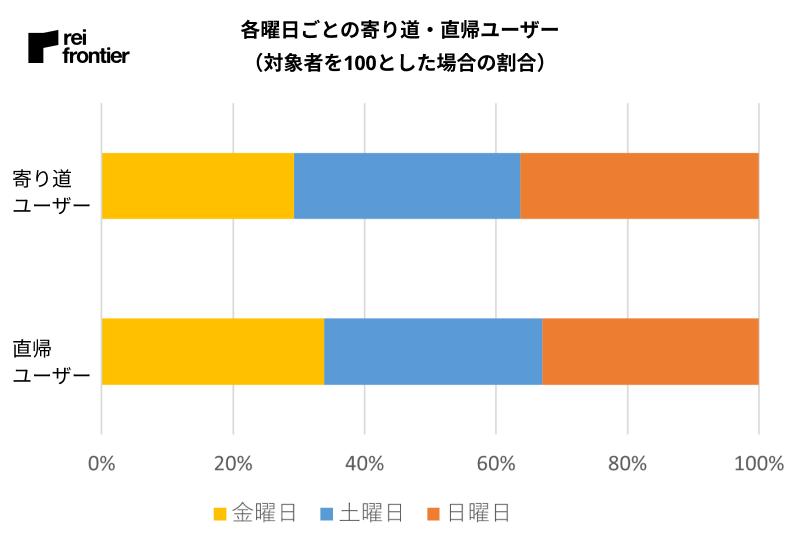 次に、曜日別で見ると寄り道ユーザーの方は土曜、日曜の比率が高くなっています。