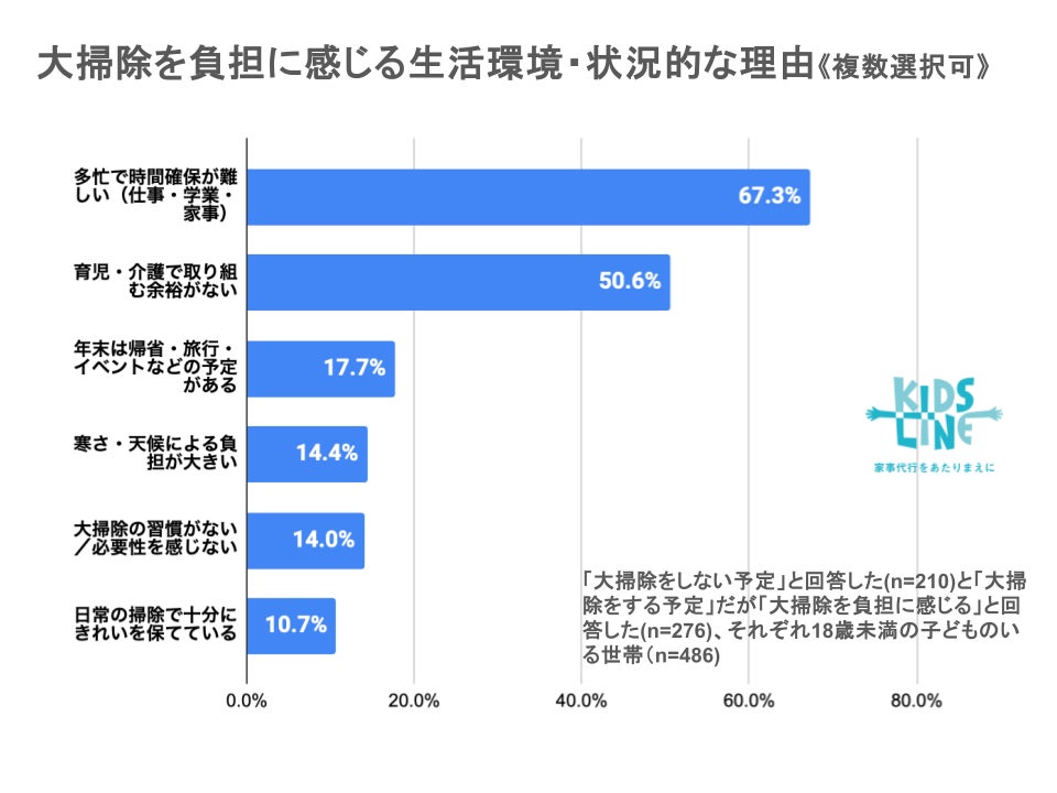 ■ 大掃除が負担に感じる理由:「やる気が出ない」心理的要因だけでなく、「時間がない」「子どもがいて進まない」など現実的な制約も
