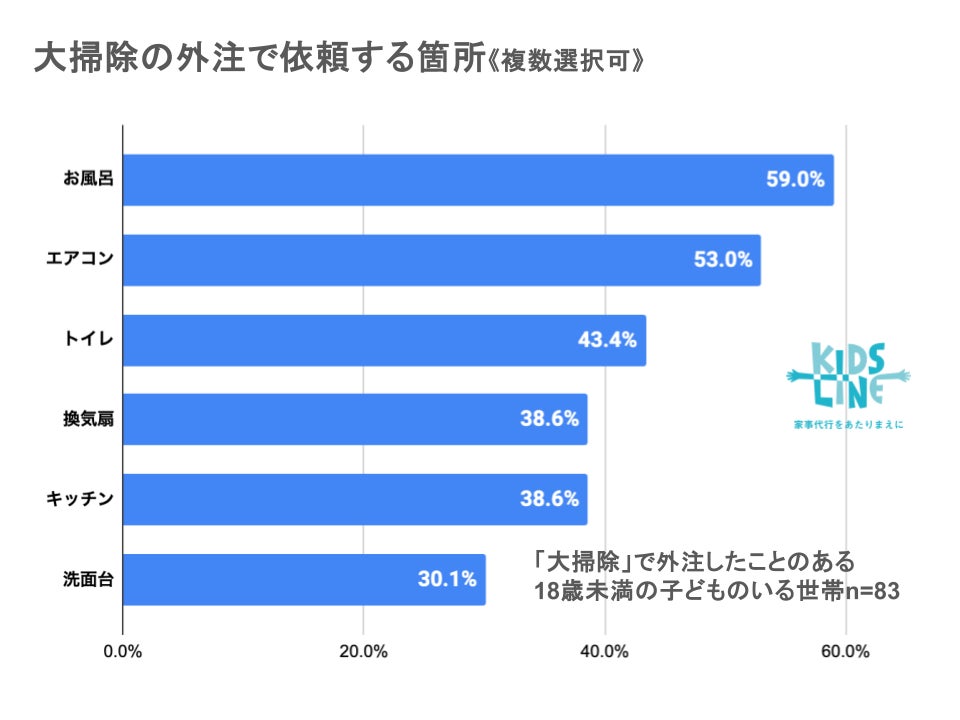 依頼箇所としては「お風呂」59.0%、「エアコン」53.0%、「トイレ」43.4%など、特に手間のかかる場所が多く挙げられました。