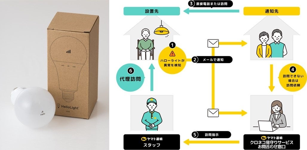 高齢化や地域コミュニティの希薄化などが進む中、ヤマト運輸が地域に根差した社会課題解決ビジネスとして2022年から全国で提供している見守りサービス。ヤマト運輸のスタッフが、利用を希望する設置先のご自宅内にIoT電球「ハローライト」を設置し、電球の点灯/消灯の動きが24時間ない場合に異常を検知し、事前に指定した通知先(例:離れて暮らす親族や知人など)にお知らせメールが自動配信される。通知先からご依頼いただけば、スタッフが設置先に代理訪問し、必要に応じて地域包括支援センターなどに連絡することも可能。