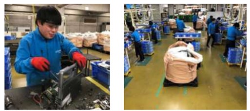 回収したパソコンは、セキュリティが確保された専用施設に運ばれ、1台ずつ手作業で解体 し再資源化処理を行います。この手作業の工程で約 30 人の知的障がいのある方が活躍してい ます。回収量が増えれば、障がい者の雇用も拡大するモデルを目指しています。
