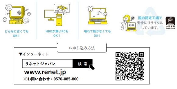 2014年、リネットジャパンは環境省・経済産業省から小型家電リサイクル法の大臣認定を取得し、全国エリアを対象とする認定事業者の第 1 号として、宅配便を活用した使用済パソコン等の回収サービスを展開しています。
