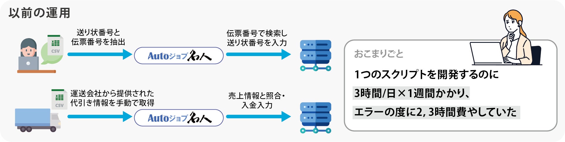 自社サイトやECサイトで個人向けに自転車部品販売を展開しているテラオは、人手不足を補うため2019年よりRPAの「Autoジョブ名人」を導入していました。ただ、開発者が社長1人であったため、RPAが止まった時のエラー対応や新しいスクリプト開発に時間がかかり、本来の社長業務にしわ寄せが来ていました。そんな時、ユーザックシステムから提案を受けたプロが開発し、メンテナンスフリーな「Robo派遣」サービスを導入することにより、低コスト、高品質なロボを運用出来、エラーも激減し、本来の社長業に専念できるようになりました。月12時間の残業代、開発コストも60万円が0円になり、削減効果もあげることができました。