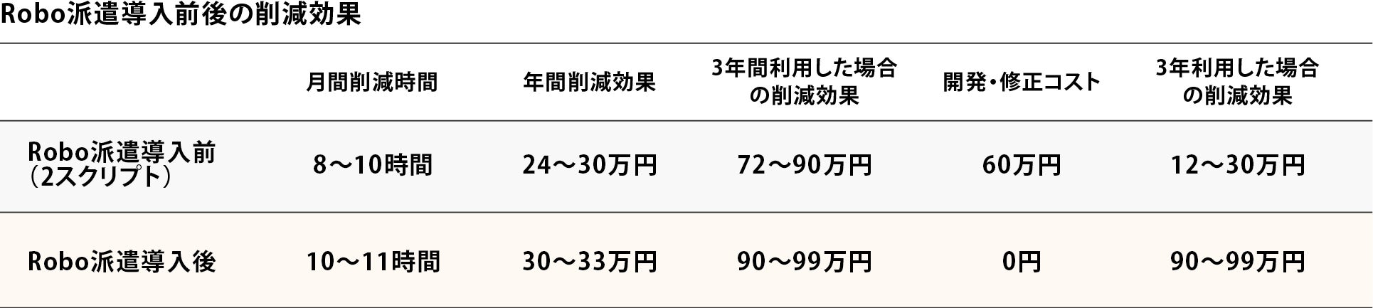 以前は、開発・エラー修正は全て私一人で行っており、スクリプトを実行する従業員はエラーが出ても私に気を遣って手作業をしていたようですが、「Robo派遣」サービスに切り替え後はすべてユーザックシステムにお任せ出来るようになったので手作業をすることがなくなりました。私自身スクリプト開発時間、エラー対応時間が0になったのは本当に大きいです。「Robo派遣」サービスは、低コストで始めやすいのもポイントです。