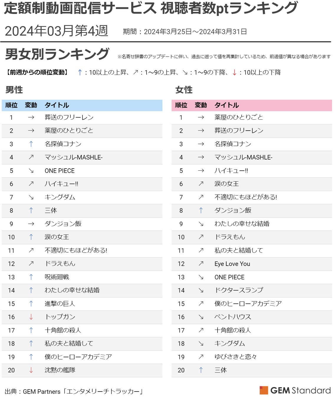 エンタテイメント業界に向けたデータ×デジタルマーケティングサービスを提供するGEM Partners株式会社(ジェムパートナーズ、所在地:東京都港区、代表取締役:梅津文)は4月3日、複数の定額制動画配信サービスを横断集計した2024年3月第4週(2024年3月25日~2024年3月31日)のコンテンツ別(※1)視聴者数ptランキング(全体・男性・女性)を発表します。