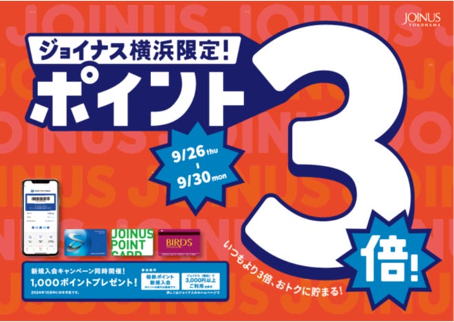 また、相鉄ポイント新規入会キャンペーンと期間限定ポイントアップも9月26日(木)~9月30日(月)の期間で開催!相鉄ポイントに新規入会された方に限り、ジョイナスで3,000円(税込・合算可)ご利用いただくと、相鉄ポイント1,000ポイントをプレゼントします。さらにおトクなポイントアップキャンペーンでは、期間中ポイントが通常の3倍となります。いつものお買い物やお食事で、おトクにポイントがたまるチャンスです。