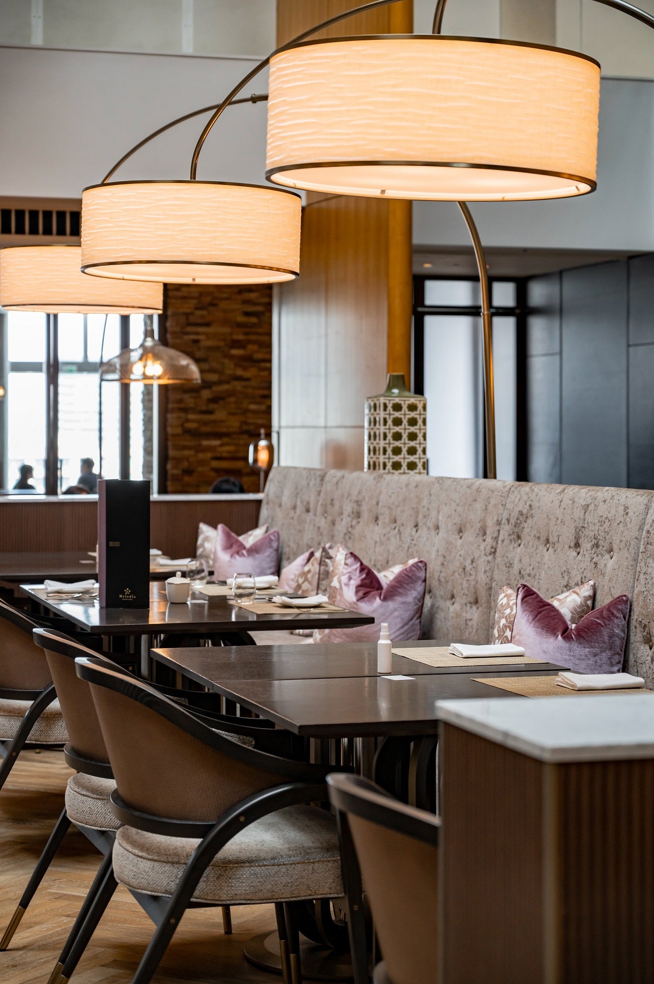 イタリアングリル「メロディア」は、音楽の要素である“メロディ”をイメージした温かみのあるデザインで、しつらえには音符や五線紙などがいたるところに散りばめられています。6層分の吹き抜けの開放的なアトリウムは、朝は爽やかな陽射しが差し込み、夜はキャンドルライトがきらめく心地よい空間に。長さ26メートルのガラスブリッジが美しく光を反射します。ブレックファストからランチ、ディナーと旬の食材を最大限に活かしたアートのようなプレゼンテーションで優雅な時間を演出します。