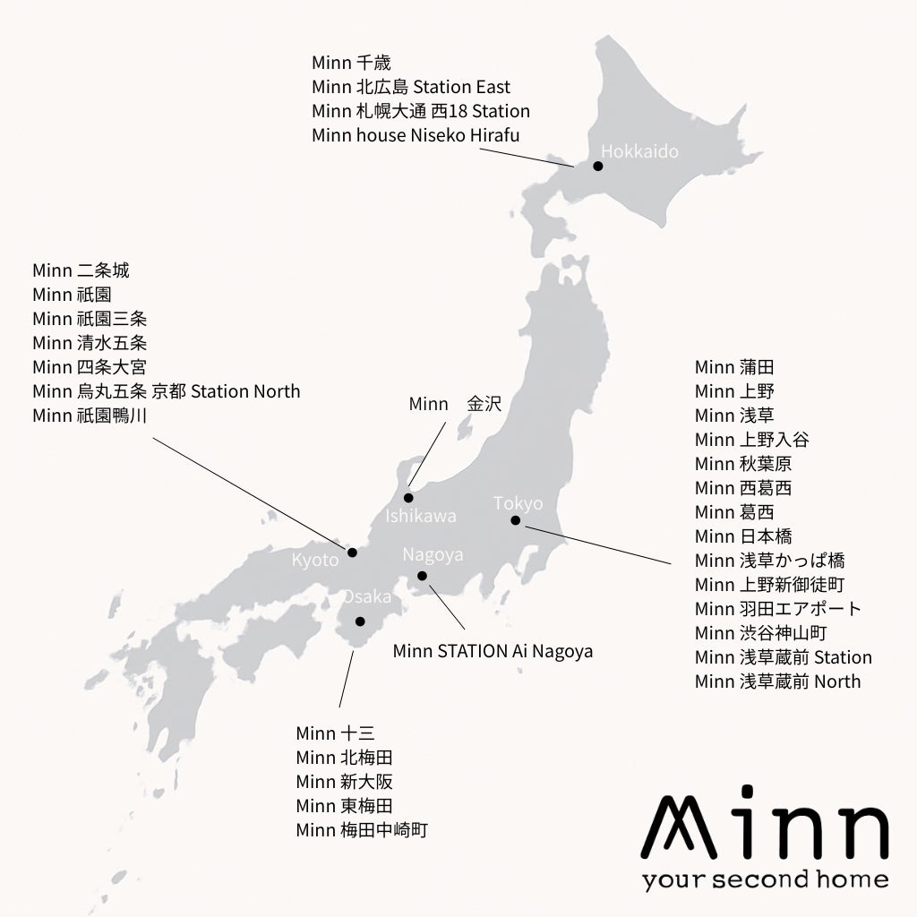 「Minn」は、“みんなで一緒に泊まれる”をコンセプトに、グループや家族の「みんな(minn)」と宿泊施設「inn」を掛け合わせたSQUEEZE独自のアパートメントホテルブランドです。25㎡以上のキッチン付き客室を中心に、第二の我が家のような滞在空間を全国で展開しています。