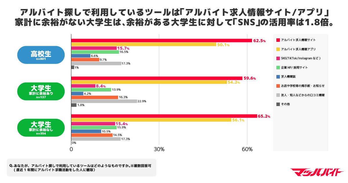 アルバイト探しで利用しているツールは、高校生・大学生ともに「アルバイト求人情報サイト」「アルバイト求人情報アプリ」が過半数超えのツートップ、次いで3位が「友人・知人等からの口コミ情報」。なお、大学生においては、家計に余裕がある人よりも家計に余裕がない人の方が「SNS(TikTok / Instagramなど)」の利用率が1.8倍高いことがわかりました。
