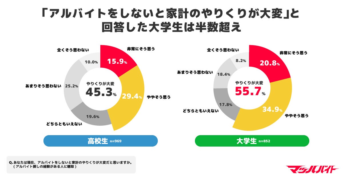 このような社会的状況下で、マッハバイトでの調査では「アルバイトをしないと家計のやりくりが大変」と回答した人は、高校生では45.3%。大学生では55.7%に及び、大学生の半数はアルバイトの必要に迫られていることがわかりました。