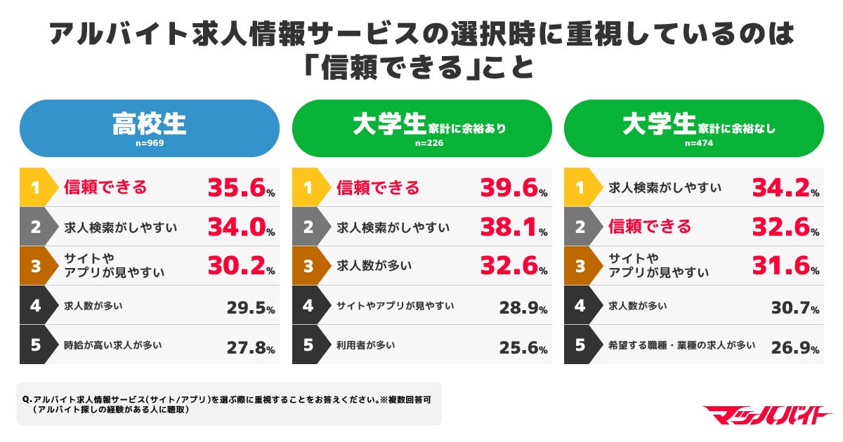 アルバイト求人情報サービスを選ぶ際に重視している項目について聞くと、高校生は「信頼できる」が35.6%とトップ、家計に余裕がある大学生も同様に「信頼できる」が39.6%とトップに。一方、家計に余裕がない大学生は「求人検索がしやすい」が34.2%とトップ、次いで「信頼できる」が32.6%となりました。