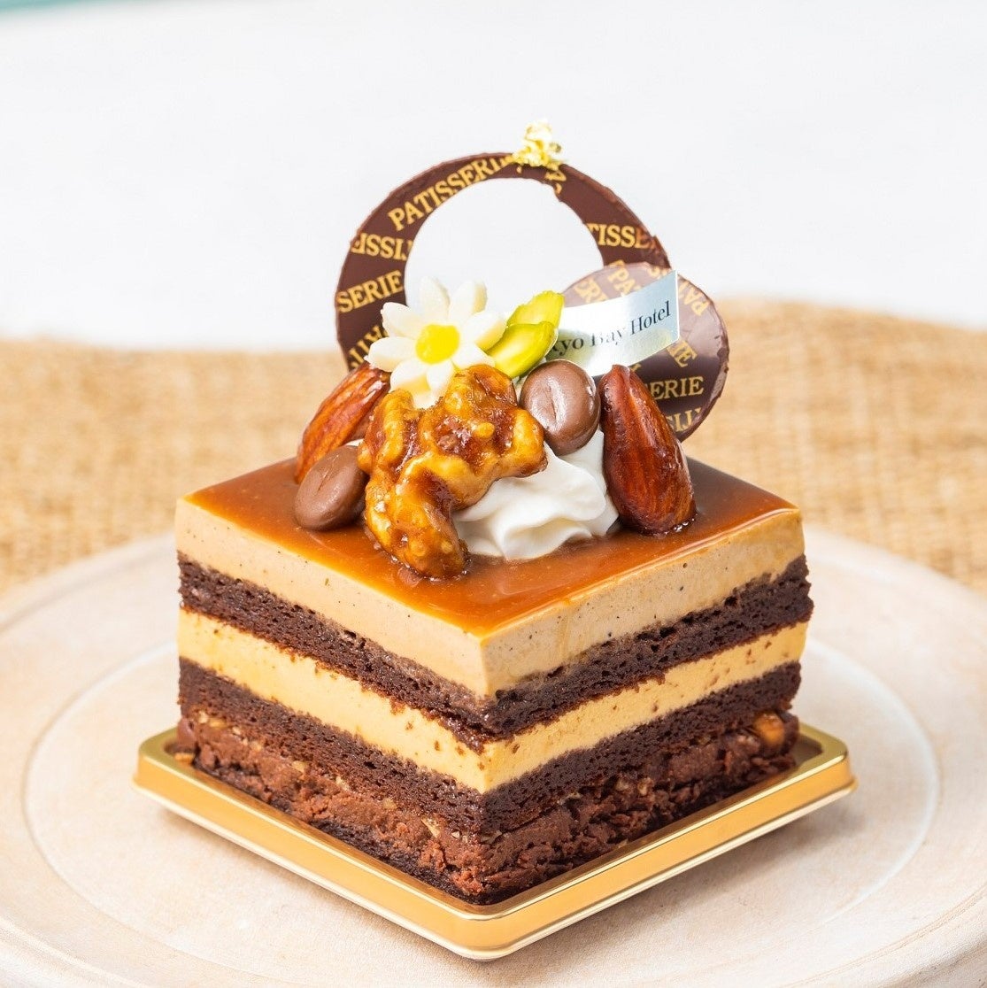 コナコーヒーのシロップをたっぷりと染み込ませた生地と、刻んだキャラメルアーモンドを閉じ込めたチョコレートガナッシュ、キャラメルムース、さらにはハワイで有名なコナコーヒーのムースを層にして重ね、キャラメルでグラサージュしました。仕上げにキャラメルコーティングしたアーモンド、クルミ、ピスタチオに、生クリームなどを飾った、コーヒーとチョコレートの組み合わせが少し大人な味わいのムースケーキです。