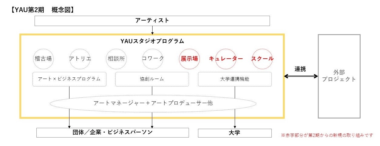 YAU第2期では、第1期と同様にアーティストスタジオ・コワーキングスペースの運用は継続し、アーティストの創作活動の拠点をまち中に創出します。第2期のハイライトは、アーティストと多様なセクターの連携構築を一層深めていくアクションです。その一環として、東京都との共同事業、東京藝術大学との連携を行います。複層的な本取り組みは、主に3つのプログラムから展開します。
