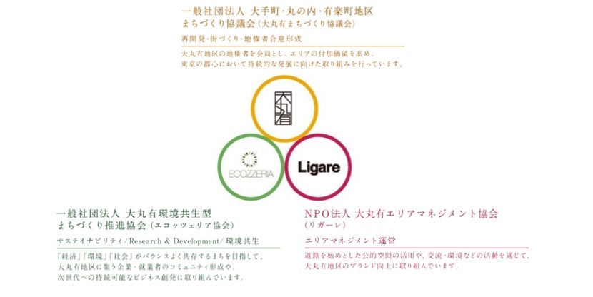 「一般社団法人 大手町・丸の内・有楽町地区まちづくり協議会(大丸有協議会)、NPO法人 大丸有エリアマネジメント協会(リガーレ)、 一般社団法人 大丸有環境共生型まちづくり推進協会(エコッツェリア)」の3団体は連携して大丸有地区のまちづくりを推進しています。