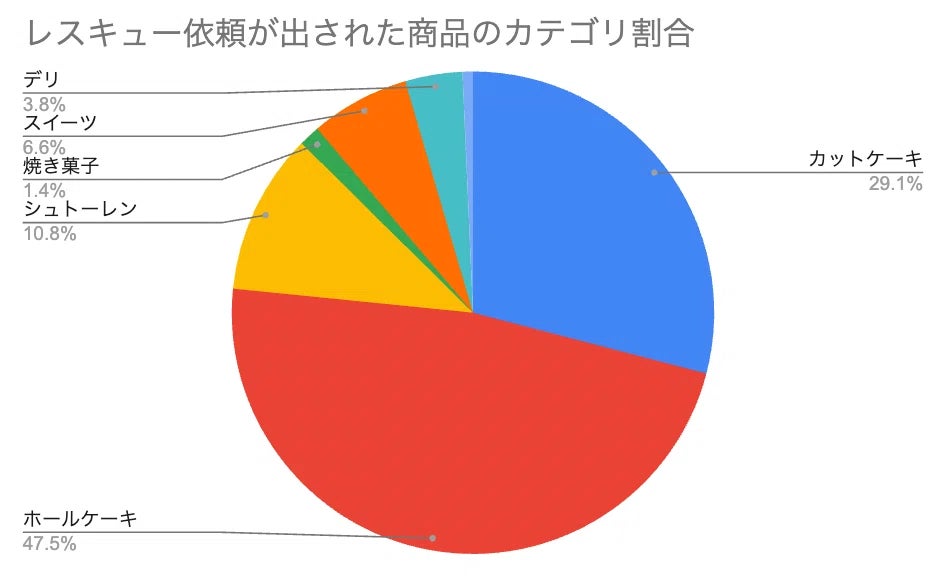 昨年のクリスマスレスキュー大作戦での出品商品割合としては、ホールケーキ、カットケーキなどのケーキ類が最も出品割合として大きく、次いでシュトーレン、その他菓子、惣菜類となっています。