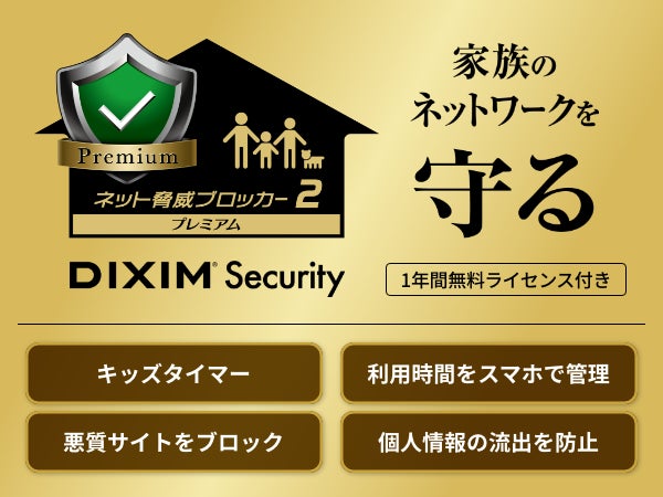 家族のネットワークを守る「ネット脅威ブロッカー2 プレミアム」を搭載しており、ご家庭にあるスマート家電をサイバー攻撃から守ります。外部からの不正な遠隔操作や、マルウェア等によるパソコン内のデータ、防犯カメラの映像などの個人情報流出を防ぎます。また、ご家庭の機器が踏み台にされて他者の機器をDoS攻撃することからも防ぎます。さらにお子様へ見せたくないサイトも設定可能です。ご家族を守りながらインターネットをご利用いただけます。