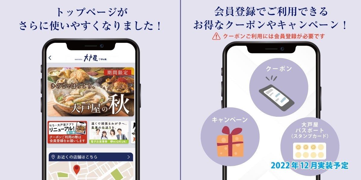 大戸屋ごはん処の公式アプリを、2022年9月5日(月)よりリニューアルいたします。ネット注文や店舗検索など便利な機能はそのままでさらに使いやすくなりました。またお得なクーポンや様々な特典を配信予定です。