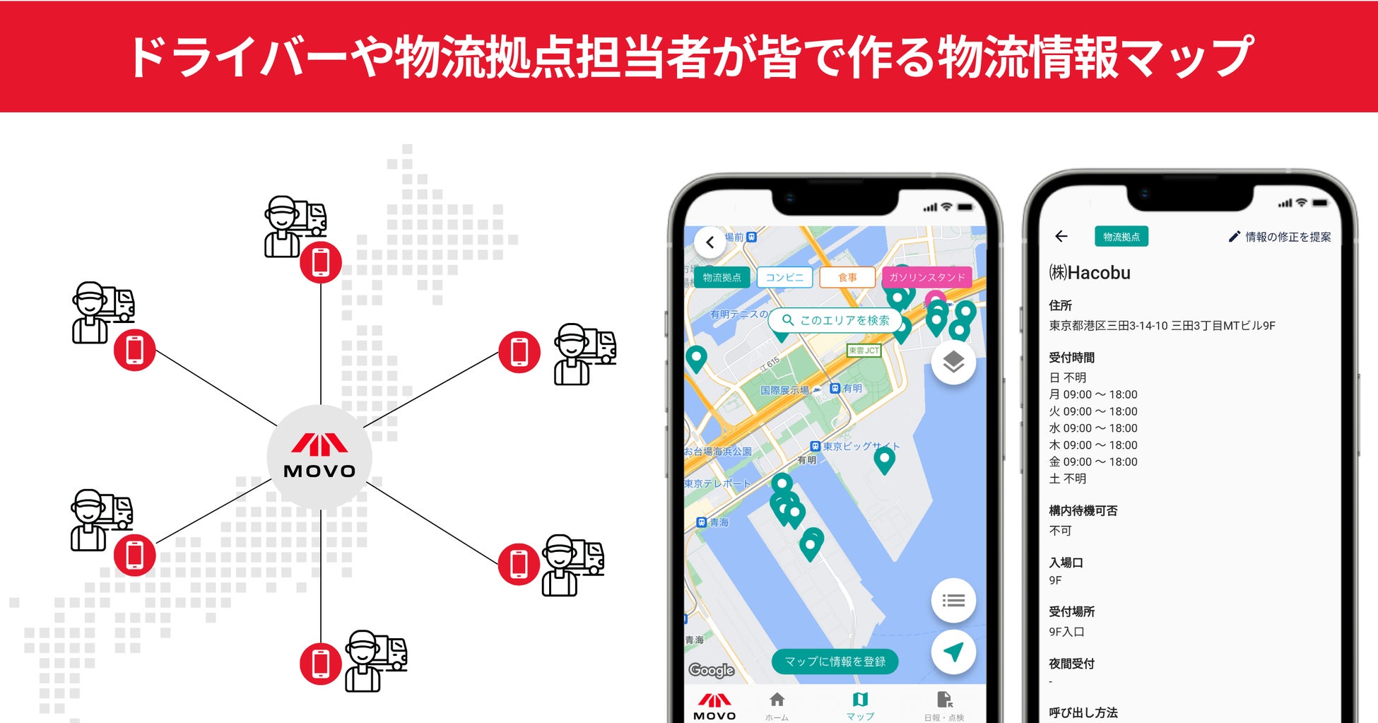 トラックドライバーの働き方を変えるスマホアプリ「MOVO Driver」、運転業務に役立つ情報を皆で追加できる「物流情報マップ」機能を実装