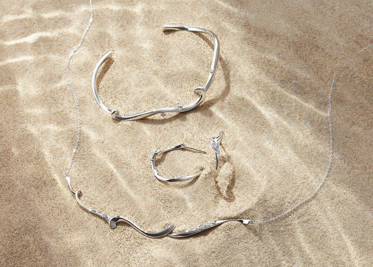 力強い有機的なウェーブラインが目を惹くシルバージュエリーは、夏らしく涼やかな波の揺らぎや海の煌めきをクールに描写。太陽を映す光の輝きは、みずみずしいストーンで色鮮やかに表現しています。