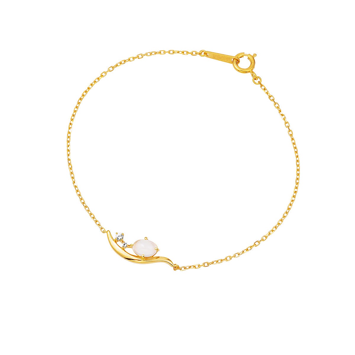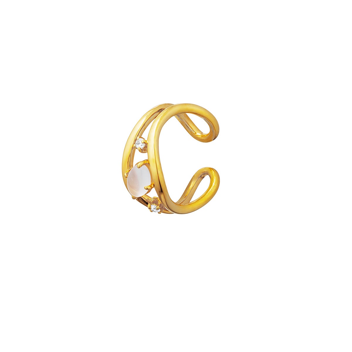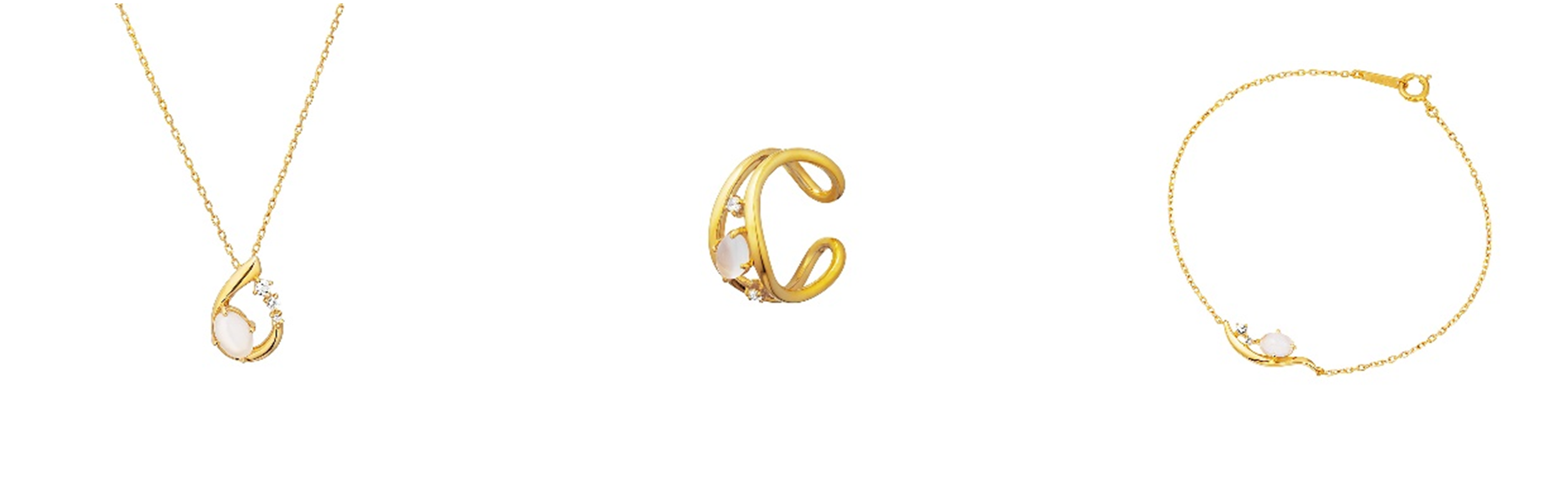 イエローゴールドの地金を繊細にウェーブさせることで、太陽に反射して水面に映し出される煌めきを上品に表現。力強い夏の白い日差しを象ったミルキーホワイトのムーンストーンが目を惹きます。手元や顔周りに夏の光のエネルギーを添えると、装いもひときわ華やかに。
