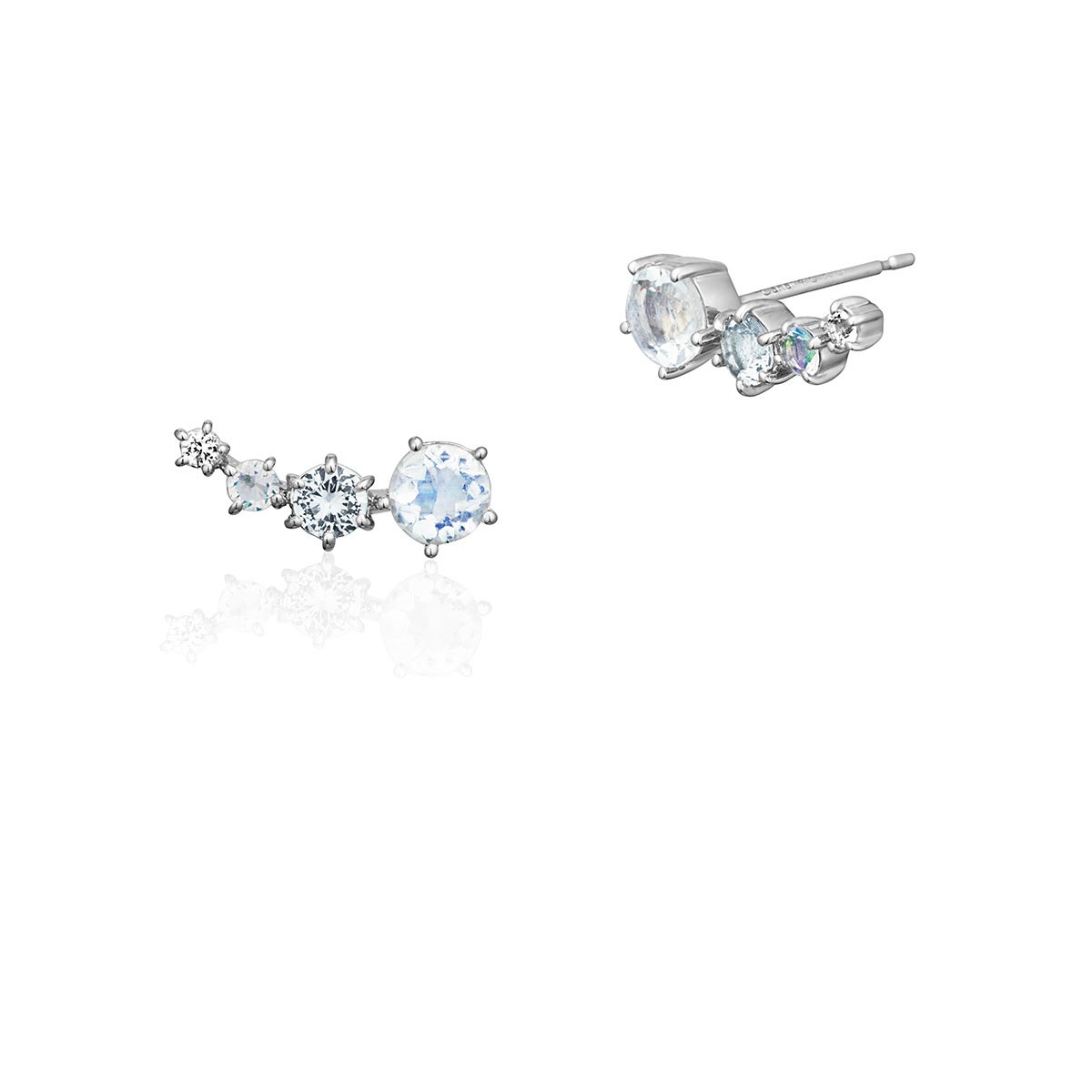 美しいブルーのグラデーションでフェルスパーやシンセティックウォーターオパールをセッティングしたイヤージュエリーは、光の角度によって一粒一粒が表情を変えます。夏めく眩い光をまとった爽やかな色合いのカラーストーンを身に着けて、あなたの新たな魅力を引き出して。