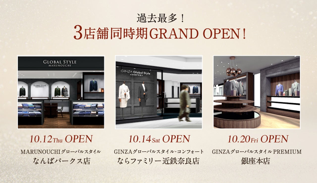 《過去最多の3店舗同時期グランドオープン!》グローバルスタイルが「オーダースーツ新店オープン記念フェア」を全店対象で10/2~10/31まで開催。