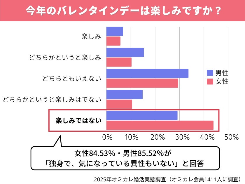 上記回答者は、男女ともにそのうちの85%程度は現在「独身で、気になっている異性もいない」と回答しており、好きな異性・気になっている異性がいるかどうかでバレンタインデーへの楽しみ度が変化することがわかります。