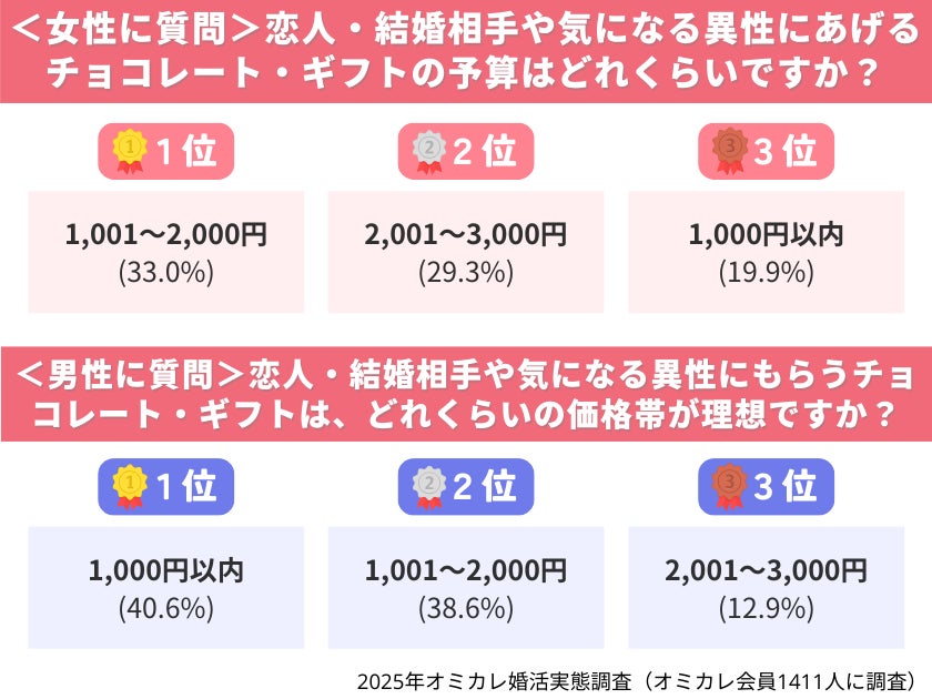 バレンタインデーのチョコレート・ギフトの予算について、女性は「1,001~2,000円」の回答が最も多かったのに対し、男性は「1,000円以内」の回答が1番多い結果に。