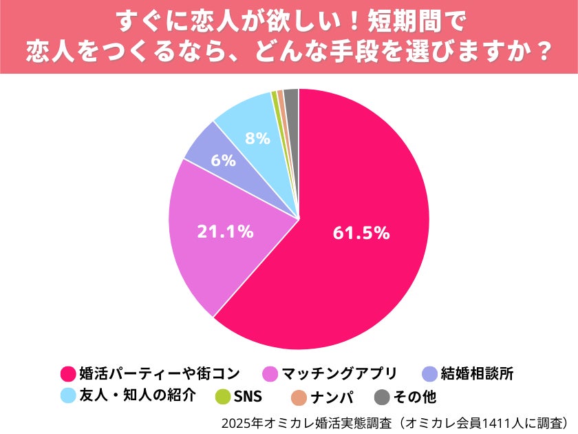 アンケートの中で、婚活者に「短期間で恋人を作るなら、どんな手段を選びますか?」と質問したところ、6割以上が「婚活パーティー・街コン」と回答。