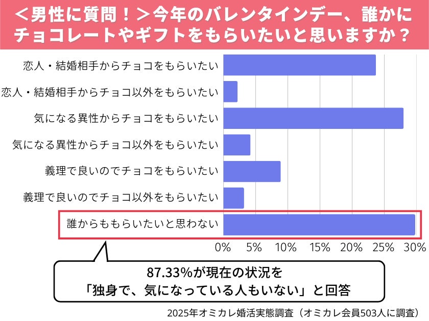 「誰からももらいたくない」と回答した人の約87%は「独身で、気になっている異性もいない」と現状について回答しており、女性と同様に現状が作用している可能性が高いと考えられます。