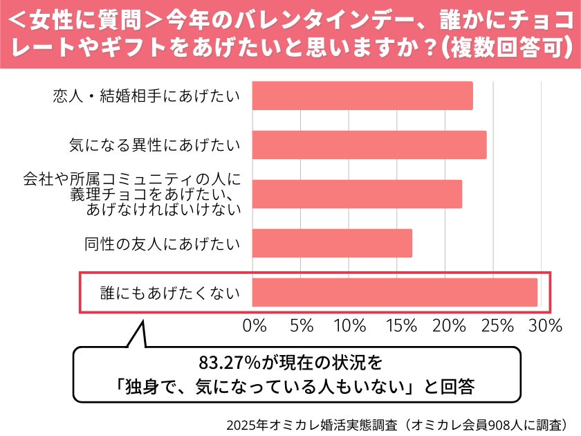 また、約30%が「誰にもあげたくない」と回答していますが、そのうちの約83%は現状について「独身で、気になっている異性もいない」と回答しており、状況によって「誰かにチョコレートやギフトをあげたい」と感じるようになる可能性もありそうです。