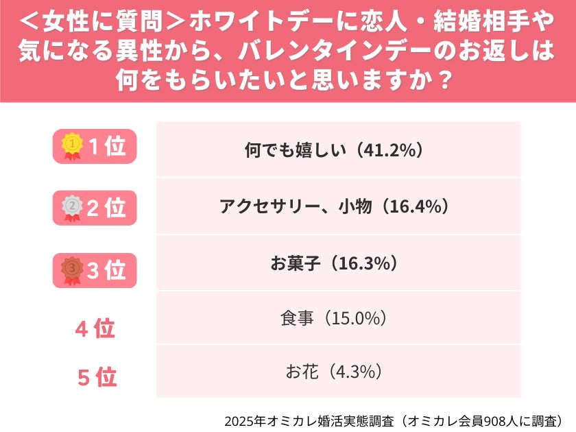 なんと女性の41%以上が、恋人・結婚相手や気になる異性からのホワイトデーのお返しは「何でも嬉しい」と回答。