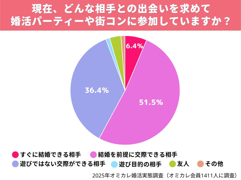 「すぐに結婚できる相手」「結婚を前提に交際できる相手」「遊びではない交際が出来る相手」の回答は約94%となり、オミカレ会員の100%近くが真剣な出会いを求めて婚活パーティー・街コンに参加していることがわかります。