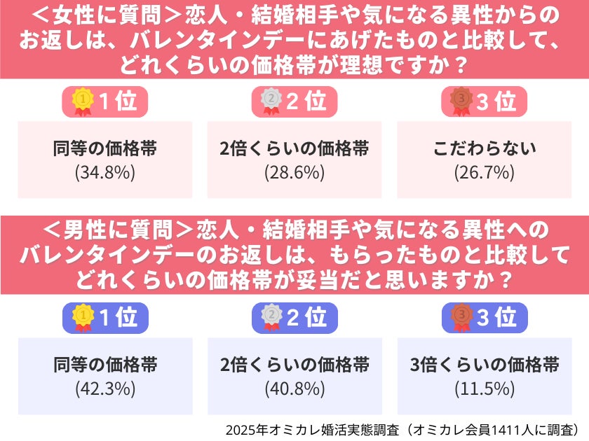 ・ホワイトデーのお返しは、男女ともに「バレンタインデーと同価格帯のもの」が理想