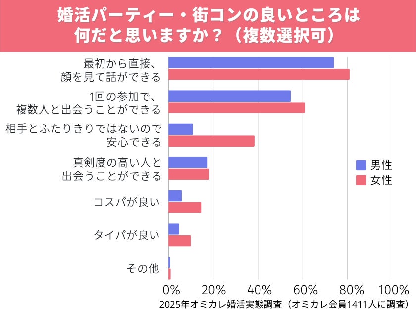 また「1回の参加で、複数人と出会うことができる」も男女ともに多くの回答がありました。