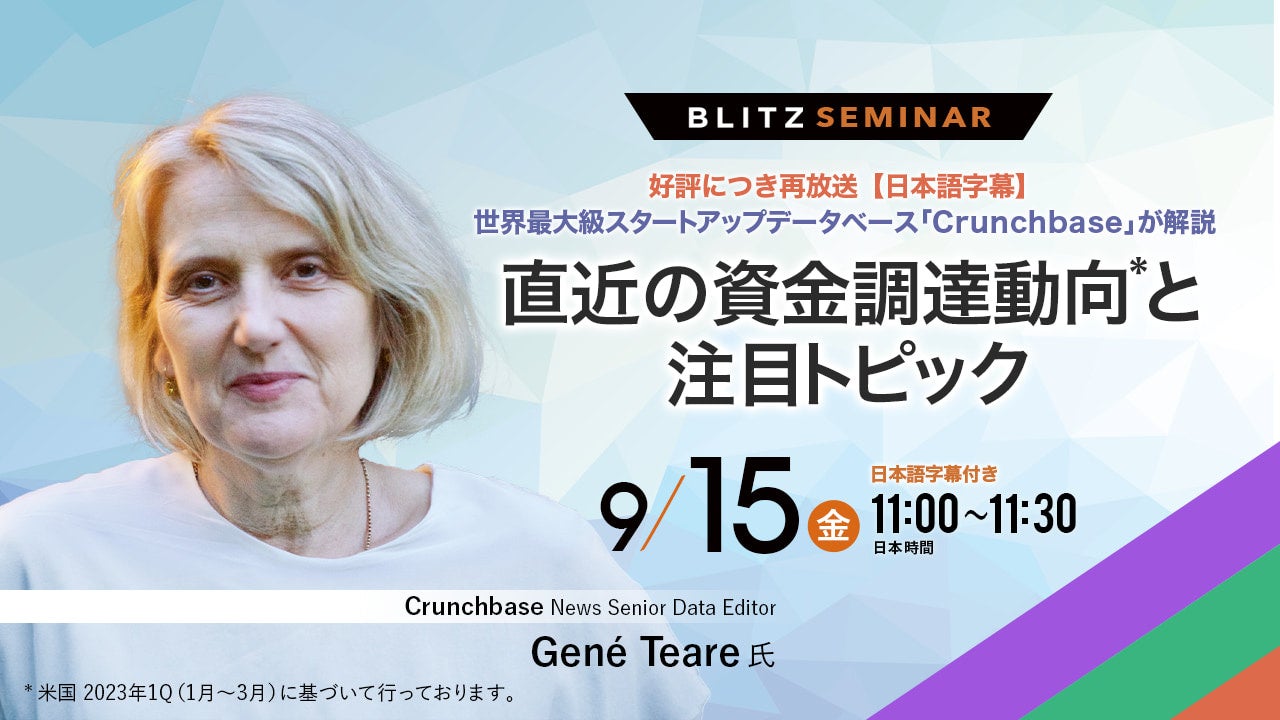 TECHBLITZ主催のオンラインセミナーシリーズ「BLITZ SEMINAR」。世界最大級のスタートアップデータベースを運営するCrunchbaseのシニアデータエディター Gené Teare 氏より、世界のスタートアップの直近の資金調達動向や今後の注目トピックについて解説いただきます。