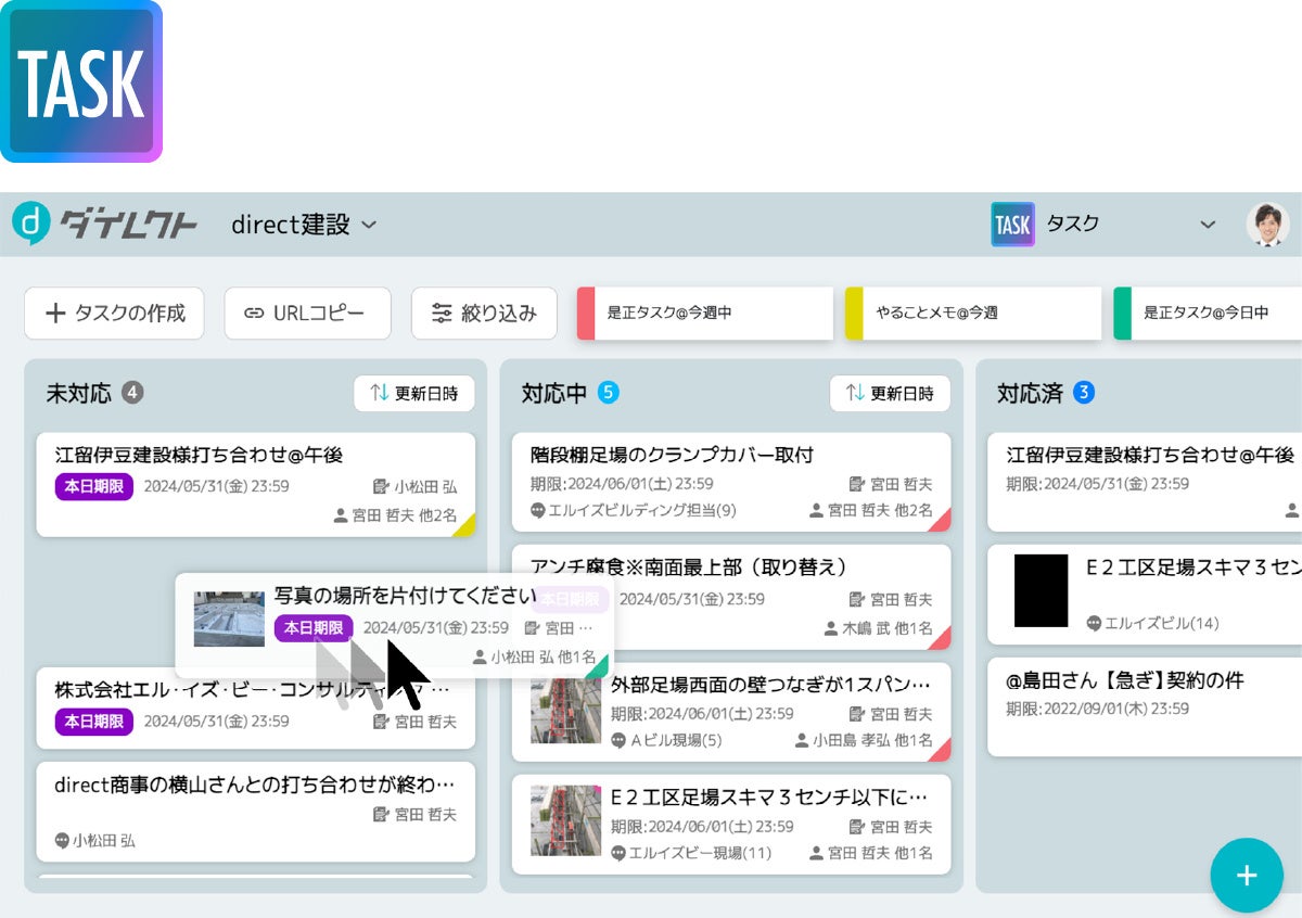 同社では、「direct」の「タスク」機能を活用することで、案件の打診から施工着手までの案件管理の工数を50%程削減されました。「タスク」機能の活用によって案件管理における課題がどのように解決されたのか、導入事例にてご紹介しています。