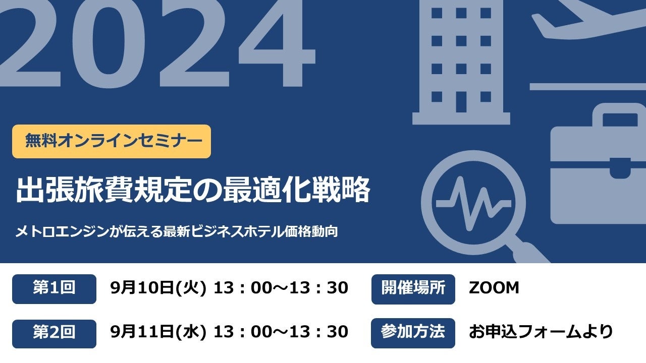 宿泊施設向けレベニューマネジメントツール『メトロエンジン』を提供し、宿泊業界のDX化や集客支援を行うメトロエンジン株式会社(本社:東京都品川区、代表取締役CEO:田中良介、以下メトロエンジン)は、2024年9月10日(火)と9月11日(水)の2日程でセミナーを開催し、メトロエンジンが独自に集積する市場データや企業様の実例を交え、出張旅費の最適化について解説いたします。今年2月と5月に実施し、多くのご好評をいただいた企業様向けセミナーの第3弾です。