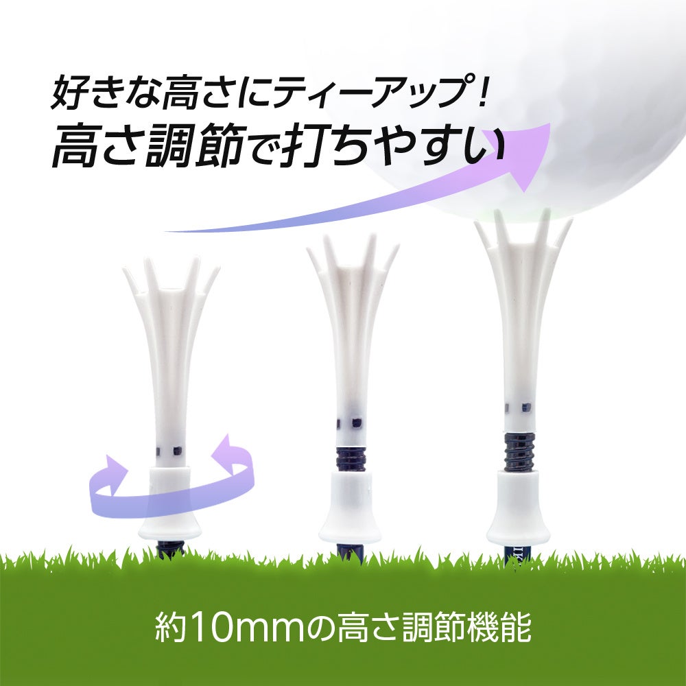 アジャスターを回して、1本でティーアップの高さを上下に約10mm調節が可能です。『トマホークティーロング』はティーアップの高さ40~50mmで設定できます。