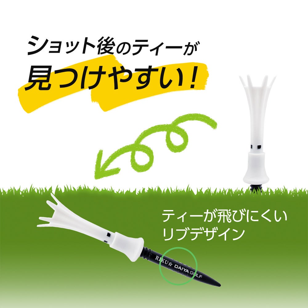 ティーグラウンドに挿さる下部には、リブが入っています。リブが入っていることで、ティーショット時に、ティーが抜けにくくなっているのでティーを探しやすい設計になっています。