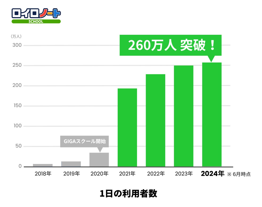 2024年7月現在、1日の利用者数は260万人を超えており、2019年12月時点から約25倍にまで増加しました。これは日本の教員、小学校から高等学校までの児童・生徒の合計 約1300万人のうち、5人に1人の割合で利用されていることを示しています。