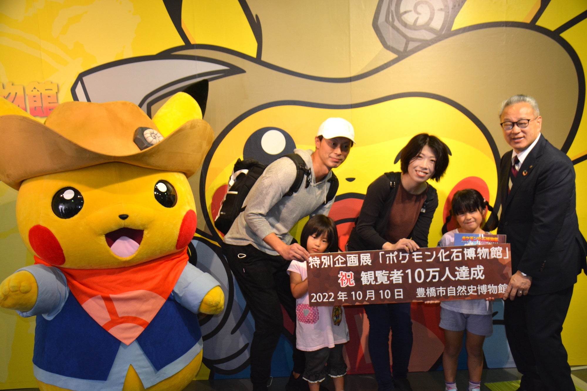 愛知県にある豊橋市自然史博物館で大好評開催中の特別企画展「ポケモン化石博物館」の観覧者数が、2022年10月10日(月・祝)に10万人を突破しました。7月16日のスタートから76日目となるこの日、館内でセレモニーが行われ、スペシャルゲストとして「発掘ピカチュウ」が登場!3連休最終日でにぎわう会場が熱気に包まれました。