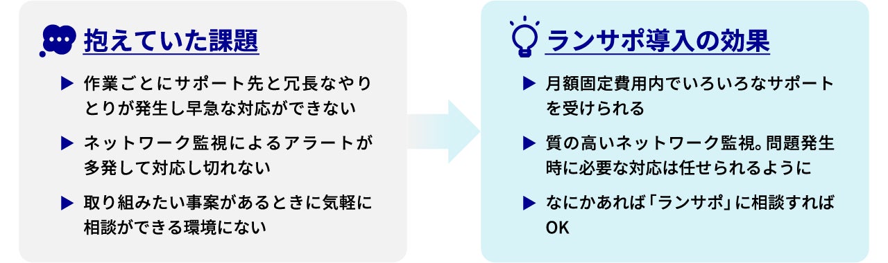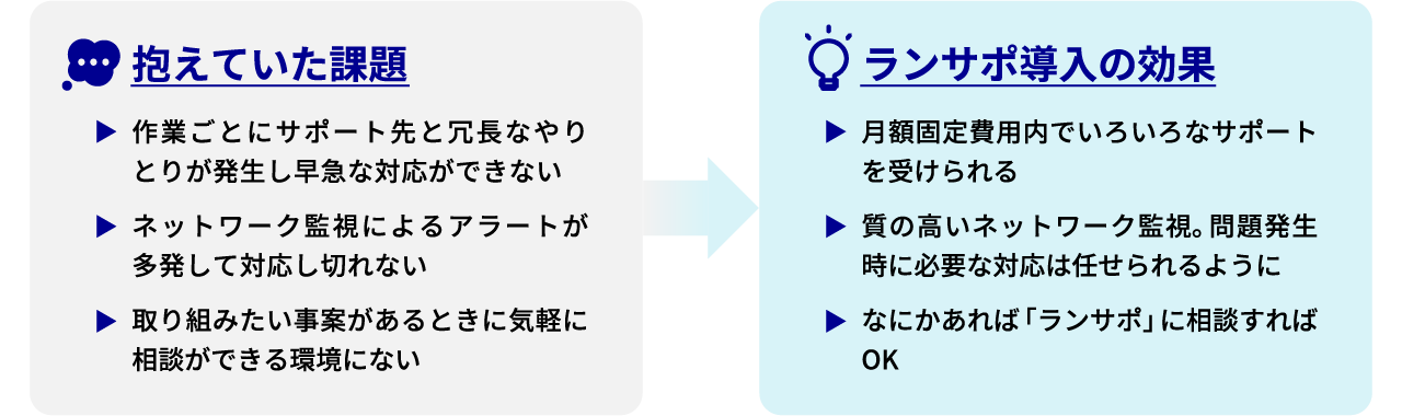 新サービスの導入検討にあたって重要視したポイントが、サポートの機動力でした。「ランサポ」は月額固定費用内であらゆるサポートを受けられること、ネットワークやシステムを構築したベンダーを限定することなく、全てのITシステムの問い合わせ先を一本化できることから、情シス業務が効率化し、早急な対応を実現できると確信できたことが、導入の決め手となりました。