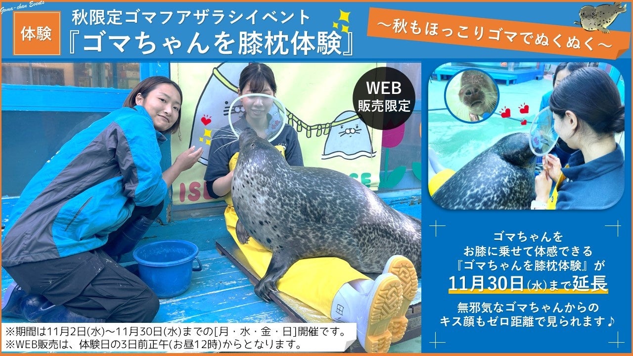 三重県伊勢市の「伊勢夫婦岩ふれあい水族館(通称、伊勢シーパラダイス)」は、2022年9月26日(月)~10月31日(月)の期間に実施している「ゴマちゃんを膝枕体験 ~ Trick or Treat!お膝に乗せないとイタズラしちゃうよ!」を、「ゴマちゃんを膝枕体験 ~秋もほっこりゴマでぬくぬく~」として、11月30日(水)まで延長します。