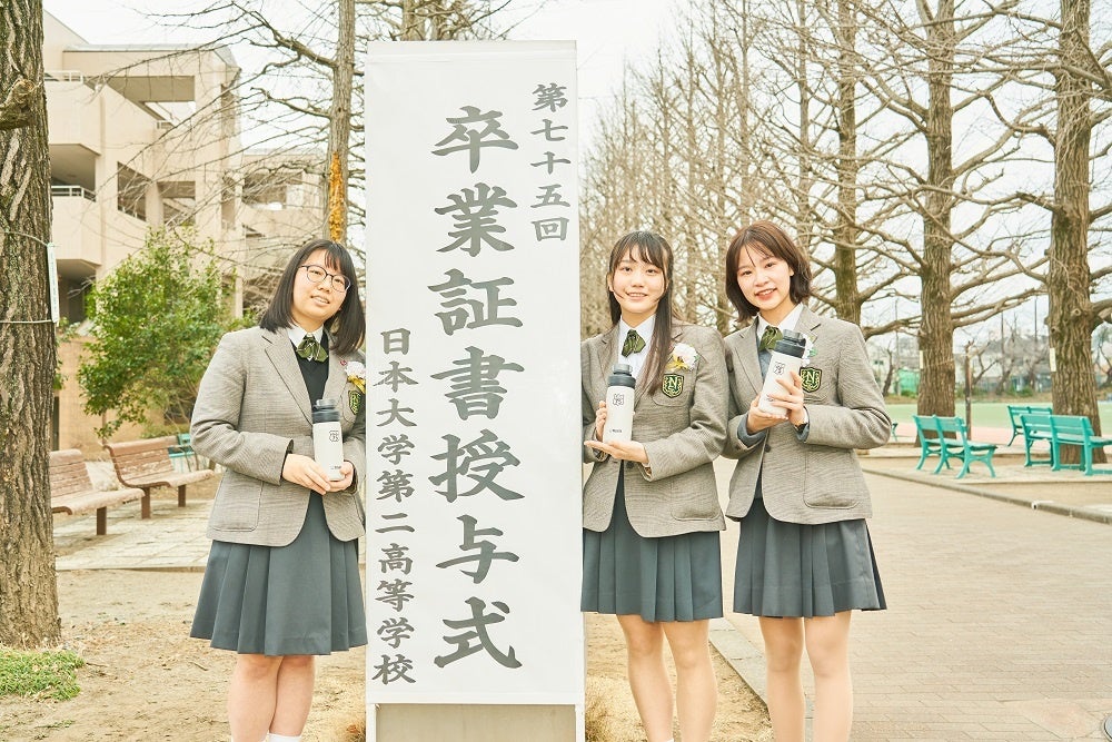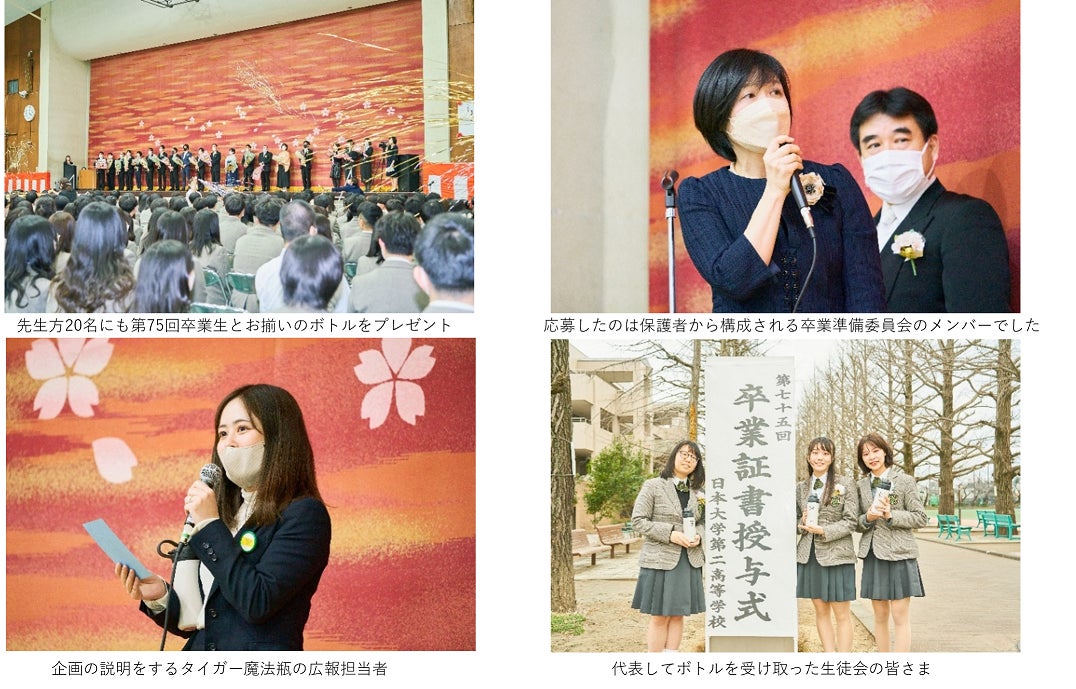 熱制御テクノロジーで世界をリードするタイガー魔法瓶株式会社(社長:菊池嘉聡、本社:大阪府門真市)は、2023年春に卒業を迎える日本大学第二高等学校の第75回卒業生400名へサプライズでオリジナルデザインのボトルをプレゼントする『タイガー魔法瓶 #青春を冷ますな ボトル贈呈式』を3月1日(水)の卒業式の日に行いました。