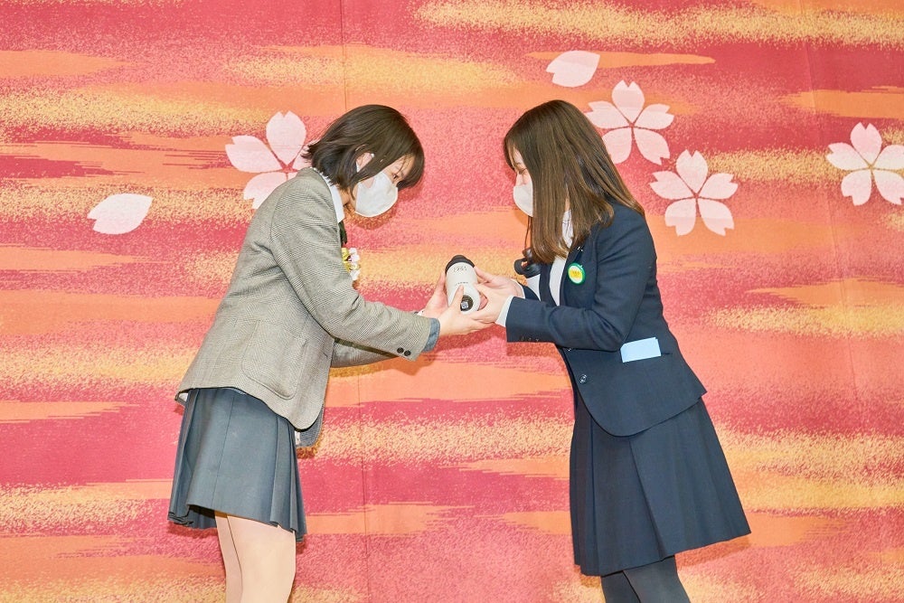 このような異例ともいえる高校3年間、それでも自分たちの許される範囲で精一杯楽しみを見出してきた卒業生に、ぜひ思い出を、という同卒業準備委員会の熱い想いに当社は心打たれ、プレゼントするボトルの本数を当初の予定の100本から卒業生全員と担任の先生の分を合わせた420本分に見直し、卒業式終了直後の体育館を訪問し、贈呈式を開催することになりました。当日は、卒業準備委員会の皆さんが卒業生のこれからを思いデザインしたオリジナルボトルを、タイガー魔法瓶から卒業生代表の生徒と先生にサプライズで贈呈いたしました。