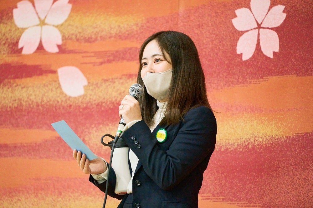 卒業生たちは思わぬサプライズに驚いた様子をみせつつも、企画内容を聞くと、マスク越しでも伝わるほどの嬉しそうな笑顔をうかべました。今回のボトルが、炭酸飲料も入れられる仕様であるというお話や、企画のルールを変更し、先生分も含めて420本贈呈することになったというお話には、会場一体が「え!すごい!」と驚嘆する瞬間もあり、保護者の方々も舞台に釘付けになっていました。