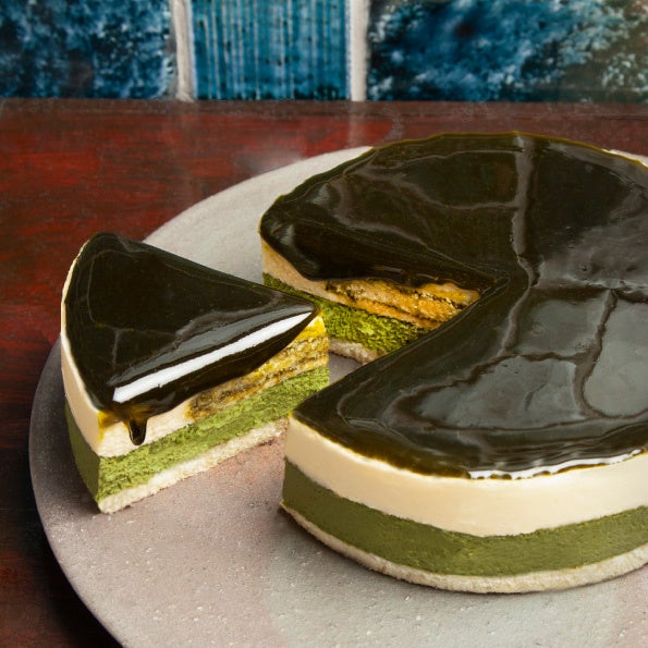 下層は抹茶のベイクドチーズケーキ。上層はレアチーズのムース。表面には抹茶のナパージュをかけ濃い抹茶の苦みを感じるチーズケーキです。