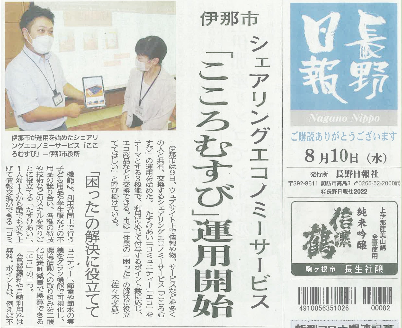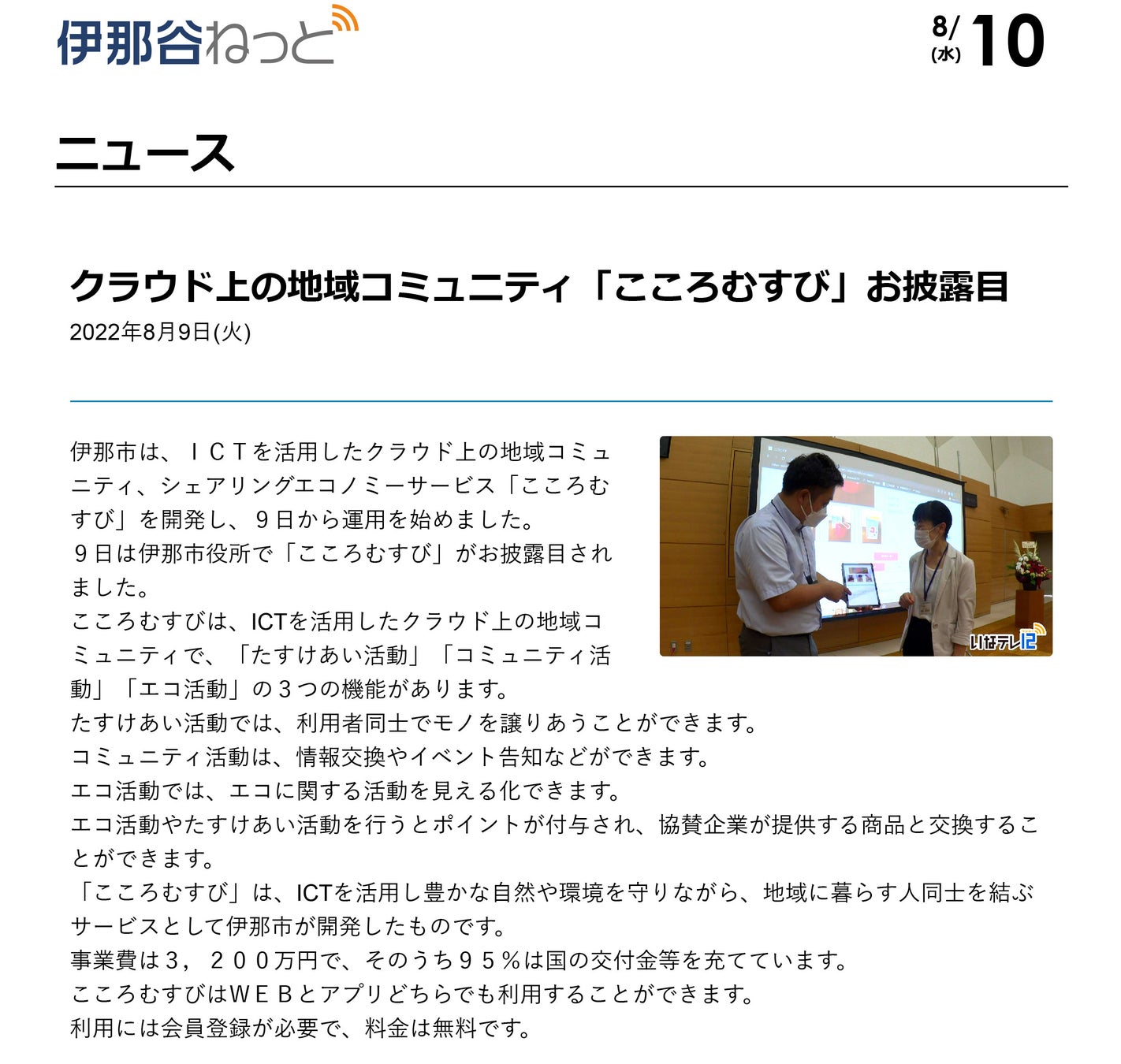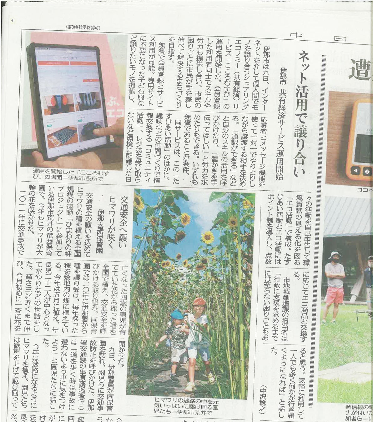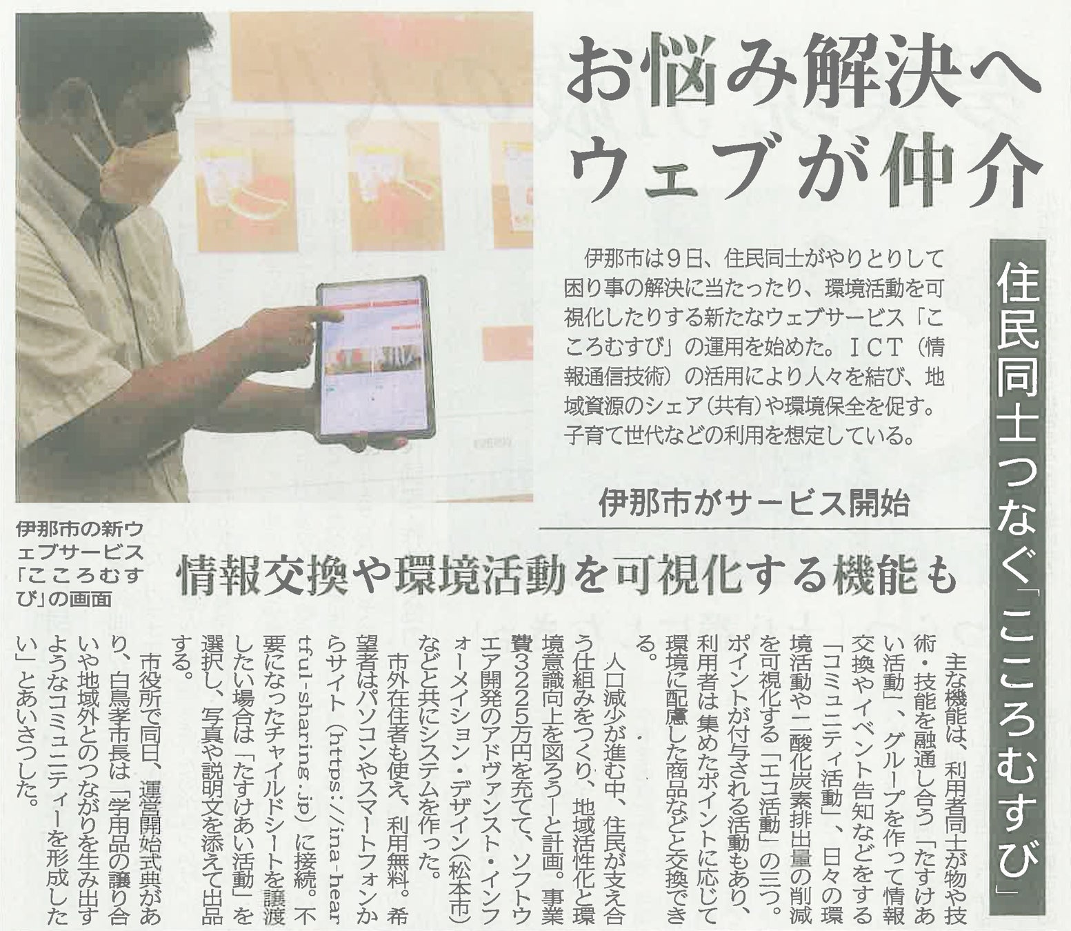 信濃毎日新聞:お悩み解決へ、ウェブが仲介 住民同士つなぐサイト「こころむすび」 伊那市