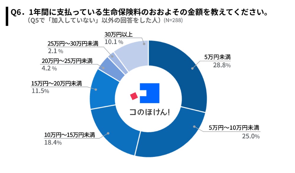 Q5で「加入していない」と回答した以外の人に対し、「1年間に支払っている生命保険料のおおよその金額を教えてください。」(N=288)と質問したところ、「5万円未満」が最多の28.8%、次いで「5万円~10万円未満」が25.0%、「10万円~15万円未満」が18.4%という結果になりました。